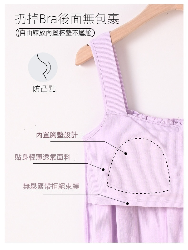 布料柔軟下垂型好,吸汗透氣不緊繃,居家不拘束。 自備胸墊,免穿胸罩。 一字「浴巾式」抹胸設計,出水芙蓉的感覺。