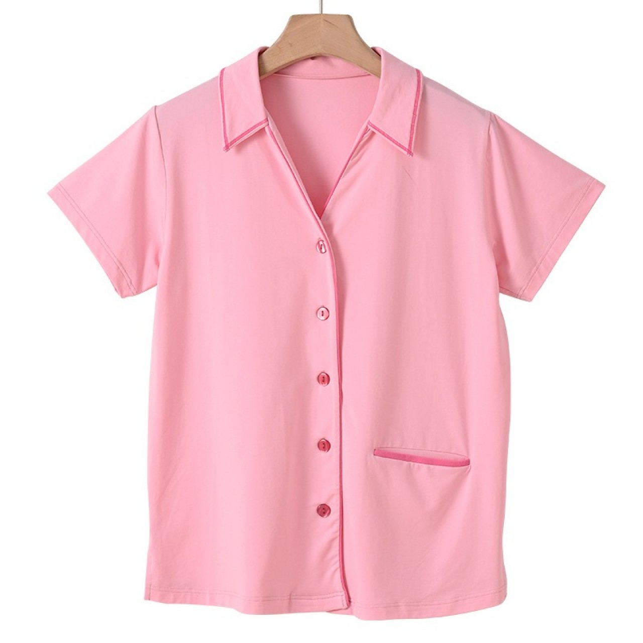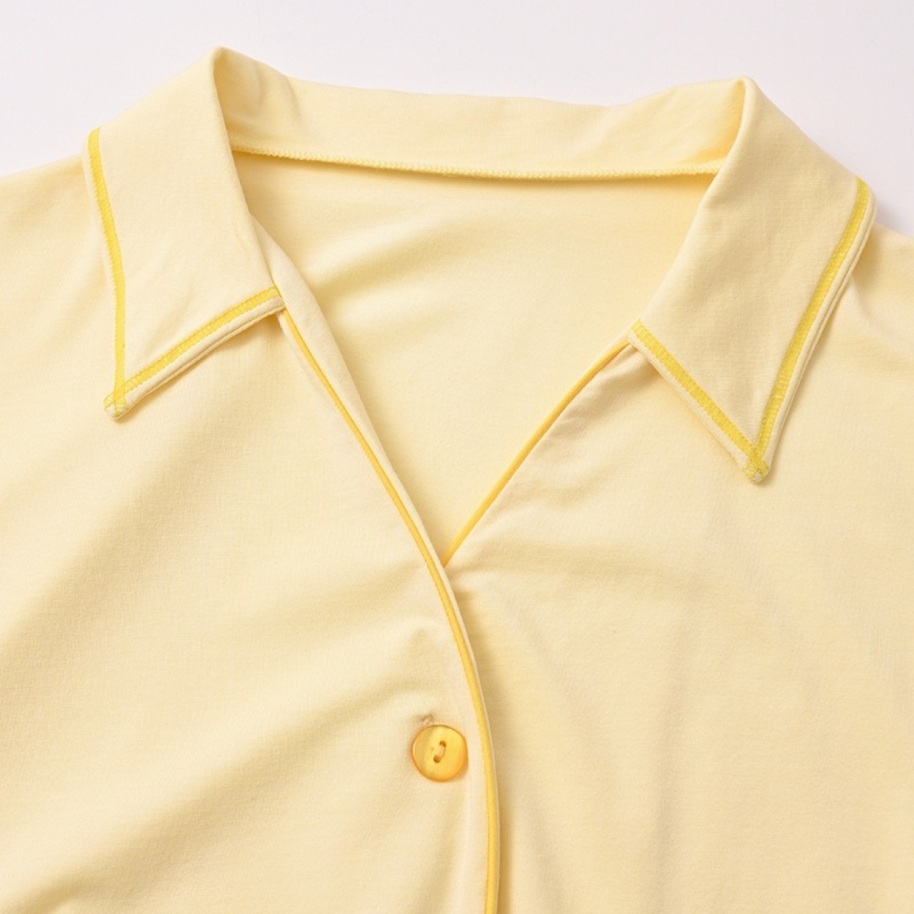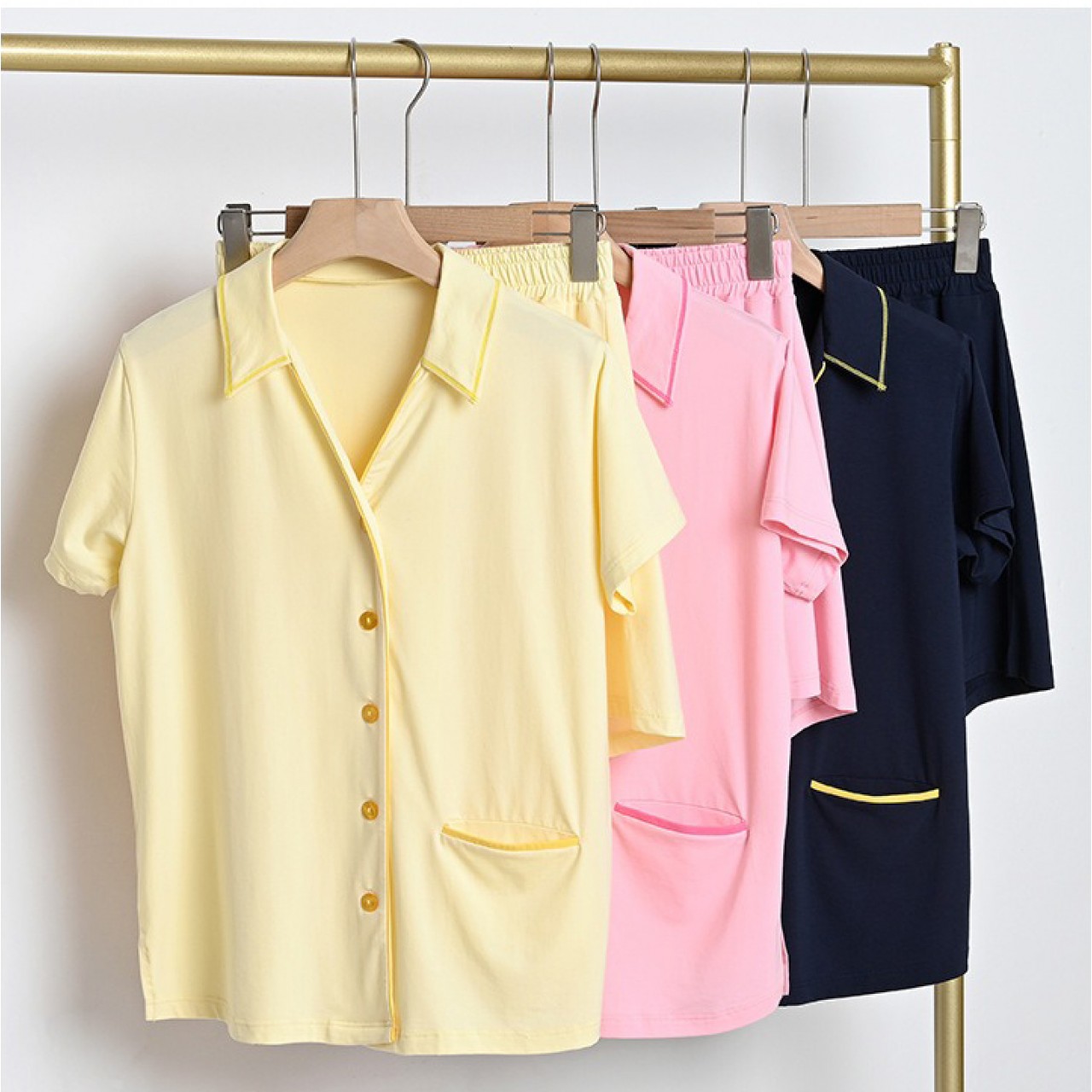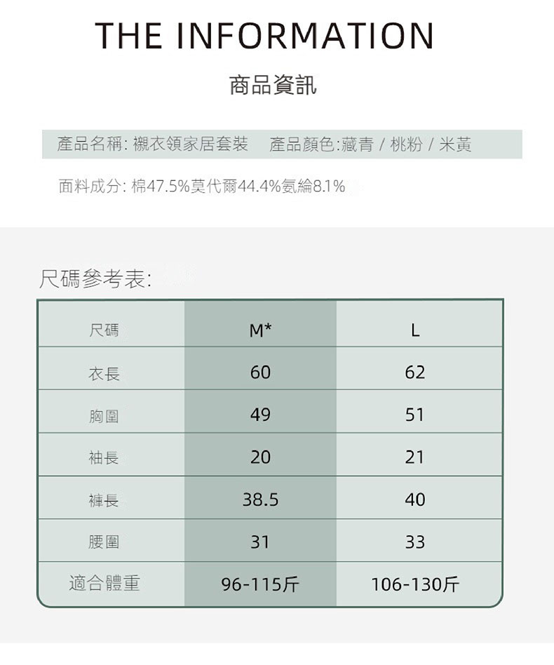 材質:棉47.5% 莫代爾44.4% 氨綸8.1% 顏色:藏青 桃粉 米黃 尺寸:M L 領型:翻領 袖長:三分袖