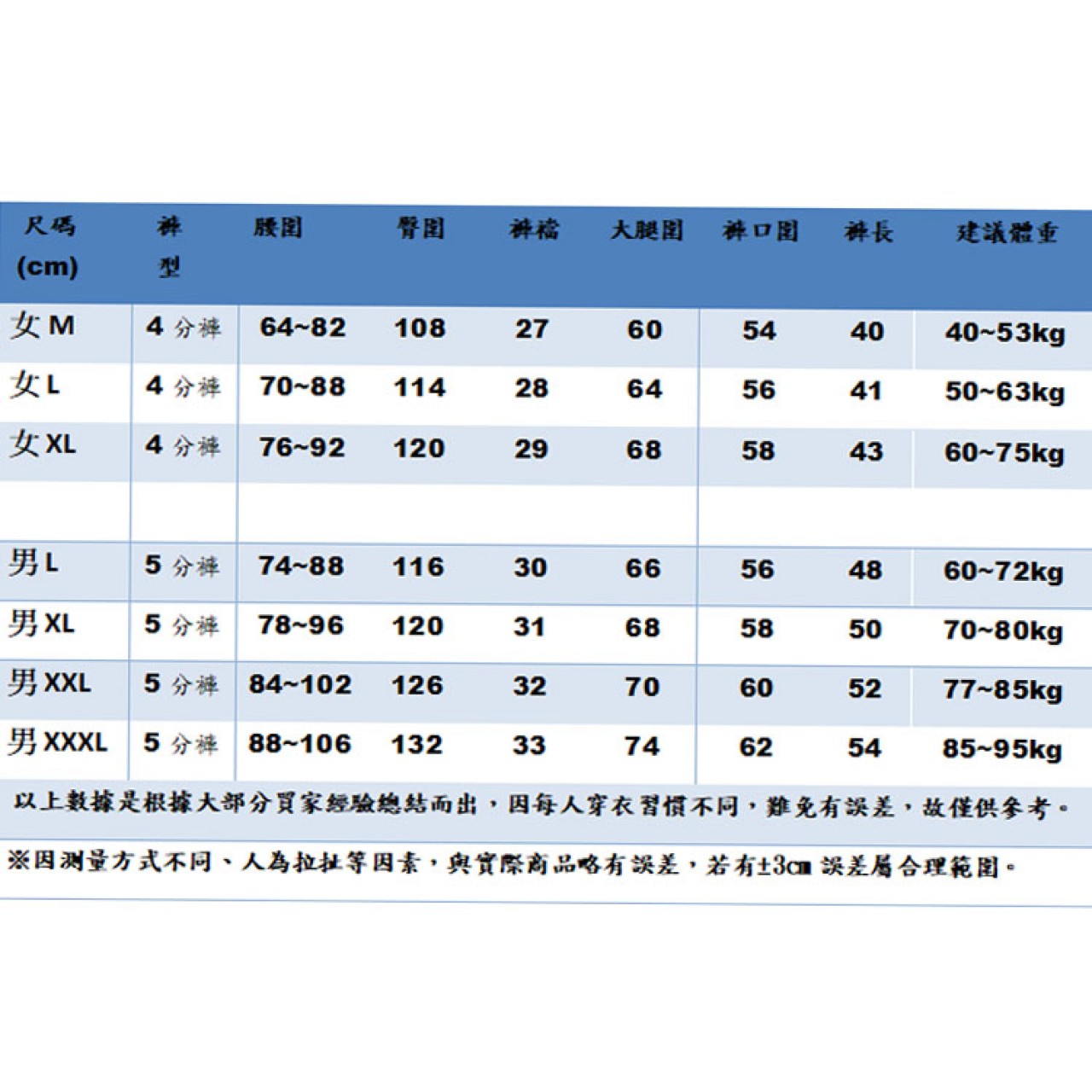 男L【60~72kg】 男XL【70~80kg】 男XXL【77~85kg】 男XXXL【85~95kg】
