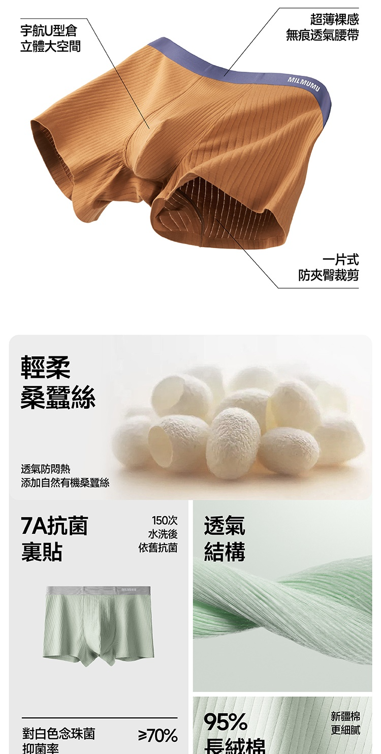 標籤: MILMUMU, 桑蠶絲, 7A抗菌, 長絨棉, 純棉內褲, 裸感內褲, 四角內褲, 安摩兒