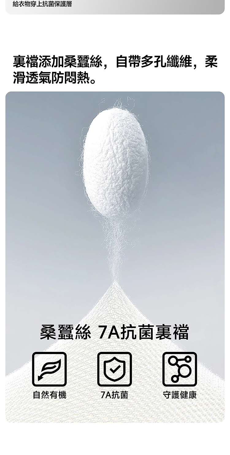 桑蠶絲7A抗菌裏檔耐水洗,抑菌除臭,透氣不悶,有效減少細菌、異味滋生。